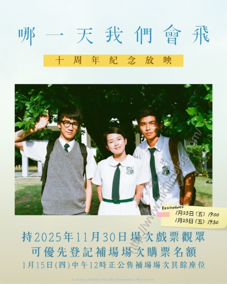 寰亞發行、陳心遙監製、黃修平執導,游學修、蘇麗珊與吳肇軒主演的《哪一天我們會飛》原安排於去年十一月三十日作十周年紀念放映。然而受到大埔宏福苑五級嚴重火災事件影響,原定的兩場紀念放映延期舉行。然而延期的新場次安排,卻於一天間有大幅度改變。