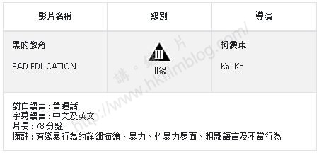 翻查負責電影檢查的電影、報刊及物品管理辦事處的記錄,《黑的教育》已於上月底完成送檢。電影片長為七十八分鐘,並設有中文及英文字幕,並因為有殘暴行的詳細描繪、暴力、性暴力場面、粗鄙語言及不當行為而被評為三級,只准十八歲或以上人士觀看。