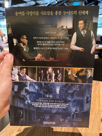 上圖所見,便是「講。鏟。片」情報人員於韓國首爾市江南區CGV江南戲院所攝,可以看到拿到了翁子光執導,梁朝偉與郭富城主演的《風再起時》資料單張。單張正面取用了兩位主角並排的設計,下方寫上「2023.07.05」的字眼,以表達該片將於七月五日在韓國上映。