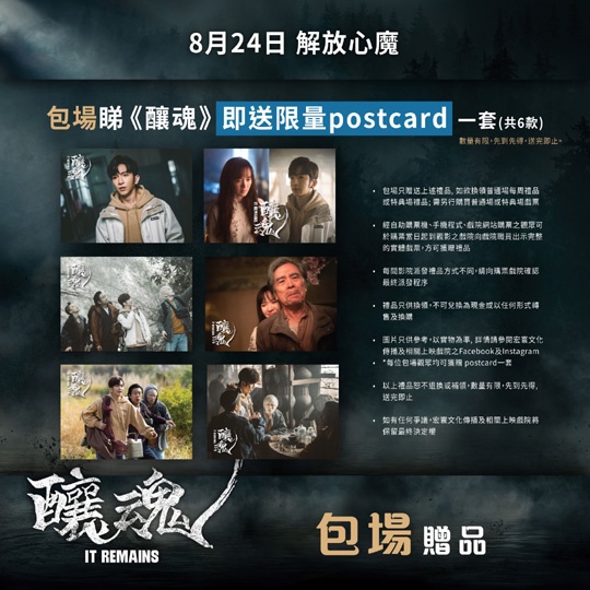 宏寰文化傳播出品、黃永峯監製、岑嘉彥執導,盧瀚霆、姜大衛、朱栢康、陳紫萱、吳肇軒、林耀聲、郭翠怡與袁澧林主演的《釀魂》將於本周四上映,而上圖所見便是電影近日的宣傳,標榜觀眾倘若以包場方式來觀賞《釀魂》的話,就可以獲得一套六款的限量明信片。