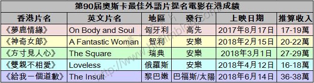 今屆五部獲得最佳外語片提名的電影並沒有法國電影,分別來自匈牙利、智利、瑞典、俄羅斯與黎巴嫩五個地區。當中高先發行的《夢鹿情緣》於去年暑假已在香港上映,並沒有奧斯卡因素下上映。而安樂發行的三部則安排於今年二月至四月奧斯卡的前後上映。然而大部份電影的成績也只在廿萬上下,即使是應屆獲獎電影《神奇女郎》亦不能倖免。這部智利電影於今年農曆新年檔期上映,惟電影看來未能吸納小眾客源,到獲獎時才受到關注,惟當時場次已所餘無幾。
