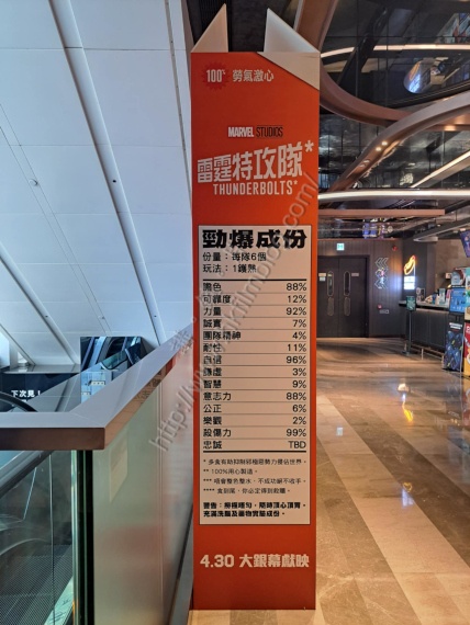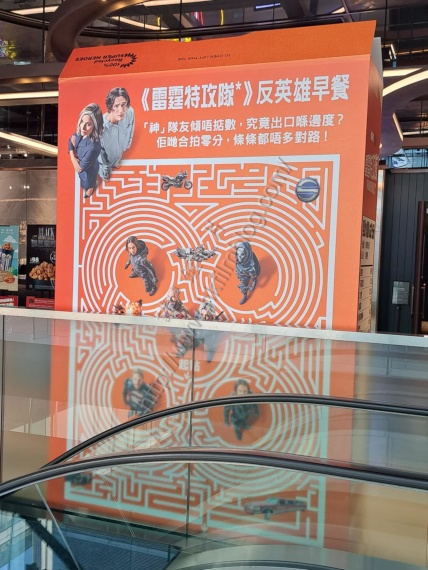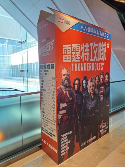 迪士尼發行的Marvel電影《雷霆特攻隊》將於四月三十日在港上映,而上圖所見則是「講。鏟。片」情報人員日前於尖沙咀iSquare英皇戲院八樓大堂所攝,可以看到該戲院已擺放了《雷霆特攻隊》的宣傳。