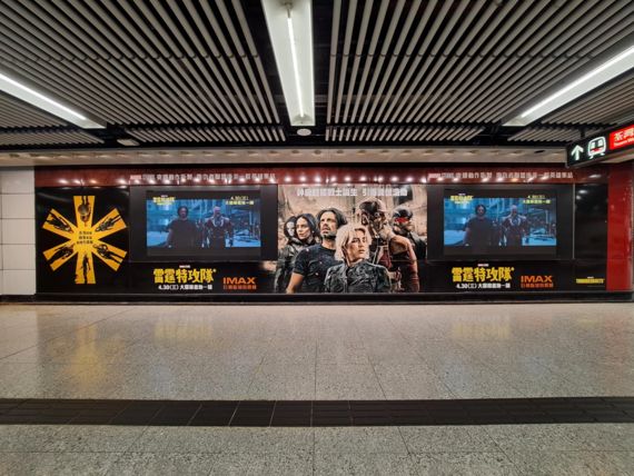 上圖所見,便是「講。鏟。片」情報人員日前於港鐵中環站的車站大堂所攝,可以看到該車站大堂的一角披上了迪士尼發行、將於四月三十日上映的Marvel超級英雄電影《雷霆特攻隊*》的電影宣傳。當中的宣傳面積包括了兩個屏幕,而兩個屏幕以滾筒式播放該片的電影預告。