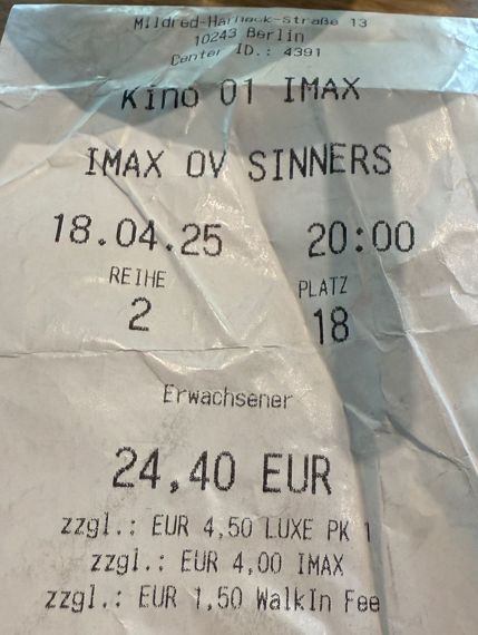上圖所見,便是德國United Cinemas International (UCI)院線旗下戲院的戲票,倘若在現場購票,即使是使用戲院現場的自助購票機購票的話口,仍需要多付1.5歐元的即場䐟票費用 。