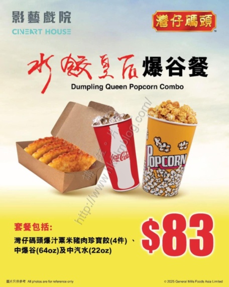 東方、洲立、銀都與安樂聯合發行,劉偉強執導的《水餃皇后》於今天上映。而上圖所見,便是影藝戲院在其官方Facebook專頁的圖片,可以看到該戲院配合該片上映推出「水餃皇后爆谷餐」。套餐包括灣仔碼頭爆汁粟米豬肉珍寶餃四件、六十四安士中爆谷一客及廿二安士中汽水一杯,整個套餐承惠八十三元一客。
