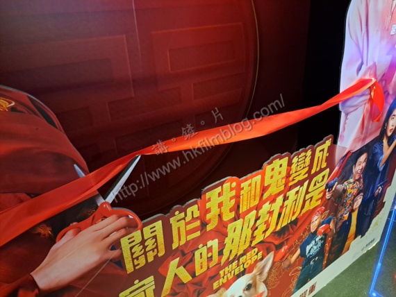英皇發行的泰國電影《關於我和鬼變成家人的那封利是》已於昨天在香港上映,而上所見,則是「講。鏟。片」情報人員於旺角Gala Cinema八樓戲院大堂所攝,可以看到該戲院擺放了大型的立體宣傳紙板。