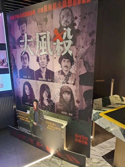 上圖所見,便是「講。鏟。片」情報人員日前於九龍站Premiere Elements戲院大堂所攝,可以看到安樂發行、將於六月五日上映的中國大陸電影《大風殺》的電影宣傳紙板,上方寫上「1996年全民禁槍話題,引爆最癲最火最喪犯罪風暴」的點題字眼。