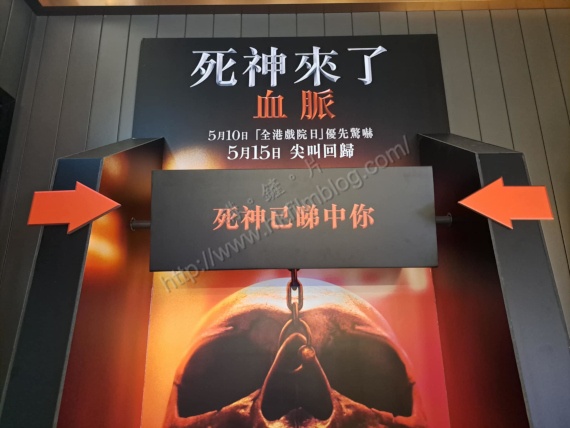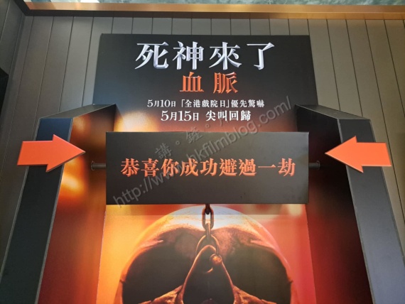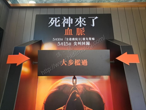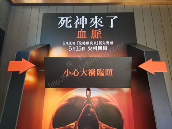 環球發行的《死神來了:血脈》繼上周末於「全港戲院日」推出優先場後,已於本周四在港上映。而上圖所見,便是「講。鏟。片」情報人員日前於尖沙咀iSqaure英皇戲院八樓大堂其中一角所攝。可以看到該戲院擺放了電影《死神來了:血脈》的電影宣傳品。