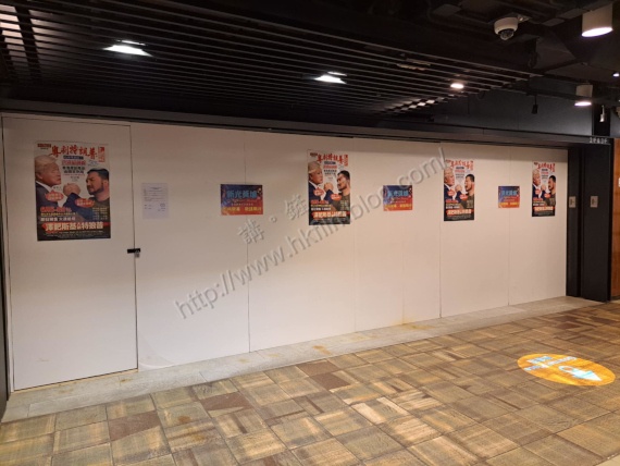 而在二樓連接酒樓的位置,已經圍上了圍板,當中除了有新光黃埔快將開幕的通告外,還貼上了四幀「粵劇特朗普」的海報,似乎是為自家的粵劇來作出宣傳。