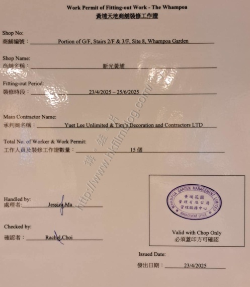 而在圍板亦貼上了「黃埔天地商舖裝修工作證」,可以看到新光黃埔獲批准的裝修期為四月二十三日至六月二十五日。觀乎戲院裝修完畢後還有其他系統安裝工程,相信也許新光黃埔或需要到七月才能正式開幕,未知大家又會否對該戲院有所期待呢?