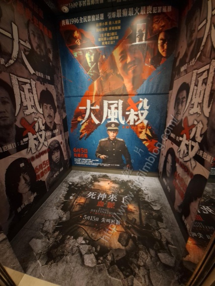 上圖所見,便是「講。鏟。片」情報人員日前於旺角朗豪坊由百老匯院線營運的Gala Cinema所攝,可以看到該戲院其中一部由地下通往八樓大堂的升降機所攝。可以看到該戲院的升降機佈滿廣告,當中其中面向升降機門的三醉張貼了安樂發行、將於六月五日上映的中國大陸電影《大風殺》的電影宣傳,而地下則張貼了環球發行於五月十五日上映的華納電影《死神來了:血脈》。
