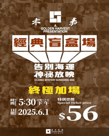 是次告別海運神秘放映的「經典盲盒場」安排於六月一日星期日下午五時半放映,而票價仍然為五十六元一票,相信三場經典盲盒場該放映不同電影。而這場終極加場的門票,亦已於嘉禾院線官方網站及海運戲院票房發售。