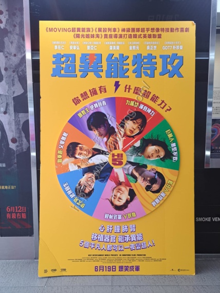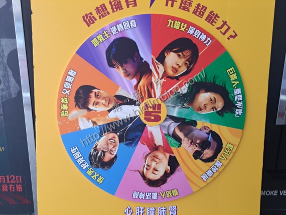 上所見,便是「講。鏟。片」情報人員近期於其中一家戲院所攝,可以看到該戲院擺放了安樂發行,將於六月十九日上映的超級英雄喜劇《超異能特攻》的電影宣傳品。宣傳品以一個轉盤為主題,七格出現片中的七位主角,並且用上了不同顏色的背景來區別。