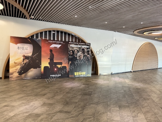至於戲院的入口,則已被三塊大型電影宣傳紙板所遮蓋。當中中央的部分,更擺放了該戲院不會放映,將於六月二十六日上映的《F1電影》。