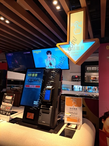 上圖所見,便是「講。鏟。片」情報人員日前於太古城中心MOViE MOViE Cityplaza票房所攝,可以看到該戲院的售票處並沒有職員駐守當中擺放了多台自助票務機讓觀眾可以自助購票。而左方卻有著一個「聯絡職員」的箭咀。