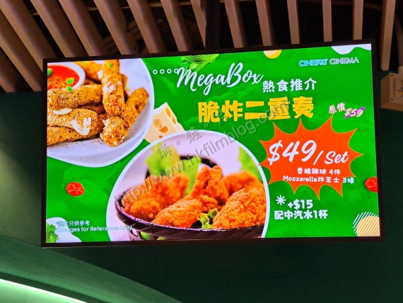 是次影藝戲院在MegaBox重點推出的熱食推介為「脆炸二重奏」,每客包括香脆雞球四件與Mozzarella炸芝士三條,原價為五十九元一客,現特價為四十九元一客,並且可以十五元加配中汽水一杯。
