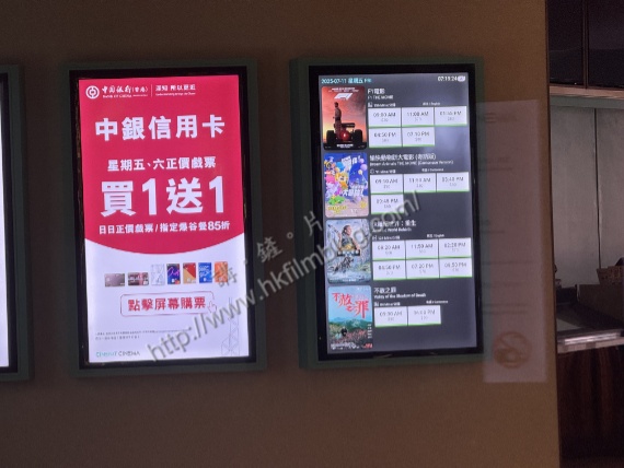 而在戲院大堂的電子屏幕,也展示了戲院各部放映電影的時間及信用咭優惠。