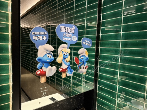 上圖所見,便是「講。鏟。片」情報人員於周末期間在尖沙咀iSquare英皇戲院所攝,可以看到該戲院的洗手間的洗手盆上的鏡,已經貼上了剛於上周四開畫的《藍精靈大電影》的宣傳。宣傳除了說明了電影上映日期外,還有提醒觀眾不要浪費水。