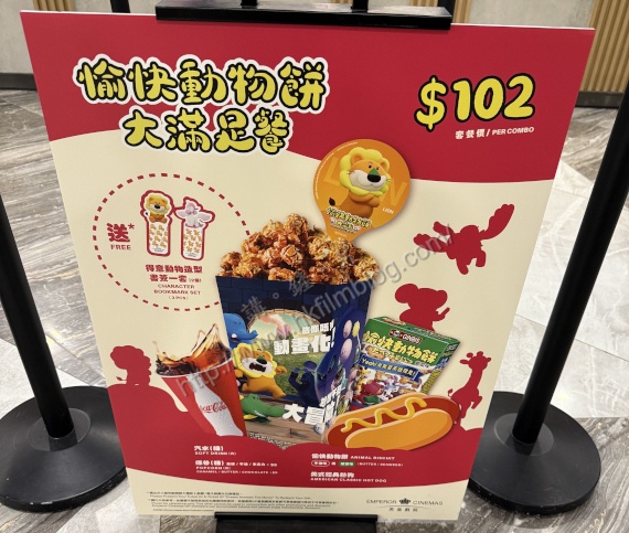 套餐包括了細汽水一客、細爆谷一客、美式經典熱狗一客,還有牛油味或紫菜味的愉快動物餅一包,而且還送上得意動物造型書簽一套兩張。當然,如斯豐富的套餐,售價也不便宜,該套餐在荃新天地英皇戲院就承惠一百零二元,而不同戲院也許在售價上也會有所差異。不知道喜歡愉快動物餅的觀眾,又會否想嘗試這款相關主題套餐的呢?
