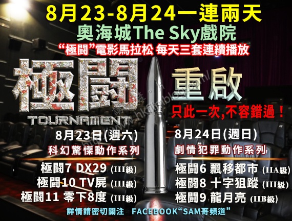 今天Sam哥便透過其Facebook專頁,再次張貼了《極闘》電影馬拉松,而放映日期與地點沒有改變,相信是即使戲院切換了經營團隊,惟是次的放映仍會繼續舉行。