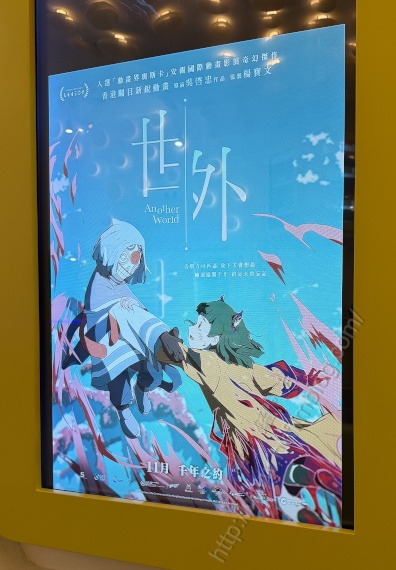 上圖所見,便是「講。鏟。片」情報人員日前於觀塘B+ cinema apm戲院大堂所攝,可以看到該戲院其中一塊電子海報屏幕,可以看到其中一塊屏幕已顯示了電影《世外》的香港初版海報,可以看到其海報設計跟海外版本相若。海報上方寫上「入選『動畫界奧斯卡』安錫國際動畫影展奇幻傑作」的字眼,而在片名下方則寫上「告別方可再遇,放下才會想起;輪迴塵間千年,約定未曾忘記」的點題字句。