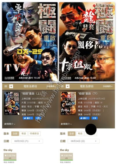 「講。鏟。片」日前曾經報導,Sam哥將安排他監製、執導、編劇兼主演的《極闘》系列近期六集於八月二十三日與二十四日假奧海城二期The Sky進行馬拉松式放映。雖然期間該戲院由橙天嘉禾變成星軼集團營運,但是並沒有影響有關的場次,而有關的場次戲票亦已於今天開始發售。