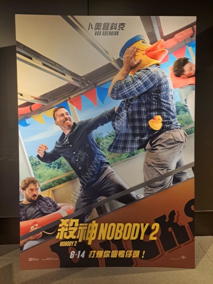 上圖所見,便是「講。鏟。片」情報人員近日於九龍站Premiere Elements的戲院大堂所攝,可以看到該戲院的大堂擺放了環球發行將於本周四上映的電影《殺神Nobody 2》的電影宣傳紙板。宣傳紙板以遊樂場為背景,並且以鴨作為主題,其中一個人的頭上更是戴上了鴨頭的裝飾。