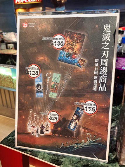 上圖所見,便是「講。鏟。片」情報人員於九龍站Premiere Elements近小食部的位置所攝,可以看到該戲院提供了不少《鬼滅之刃》的周邊產品,包括了180元的劇場版拼圖,以及售價由89元至175元不等的鎖匙扣。