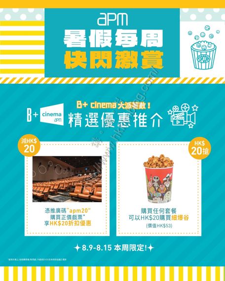至於另一個優惠,就是凡於B+ cinema apm購買任何套餐,就可以用二十元來購買原價為五十三元的細爆谷。