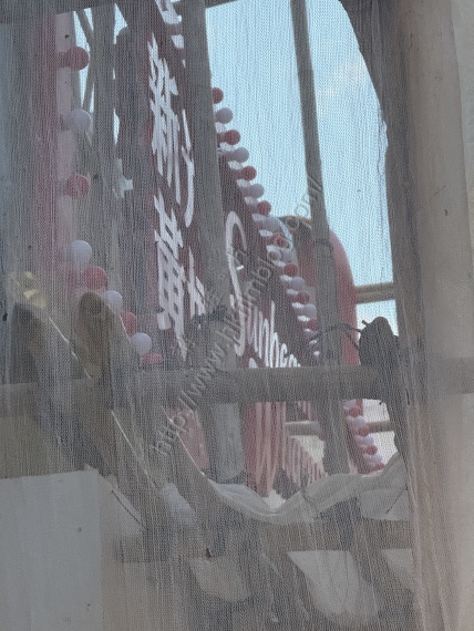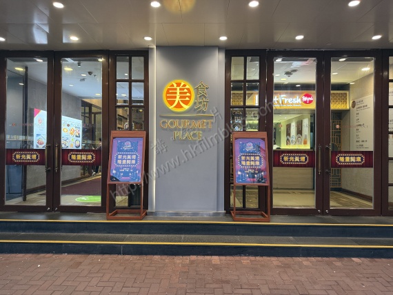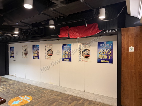 而二樓連接酒樓的入口,則仍圍上圍板,但除了海幕的海報外,還有「明星名人書畫攝影展」的海報。