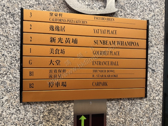 升降機的指示亦顯示了新光黃埔位於該商場二樓,惟字款跟其他的款式略有不同。
