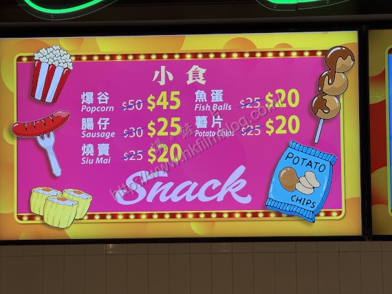 先來看看小食的售價,當中爆谷為50元、腸仔為30元,而燒賣、魚蛋及薯片則為25元,而目前各款小食均提示五元優惠,小食水平較主要各大院線更為相宜。