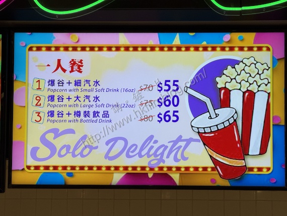 戲院的一人餐共有三款,以爆谷配上不同的飲品,而售價由70元至80元不均,現提供15元優惠。