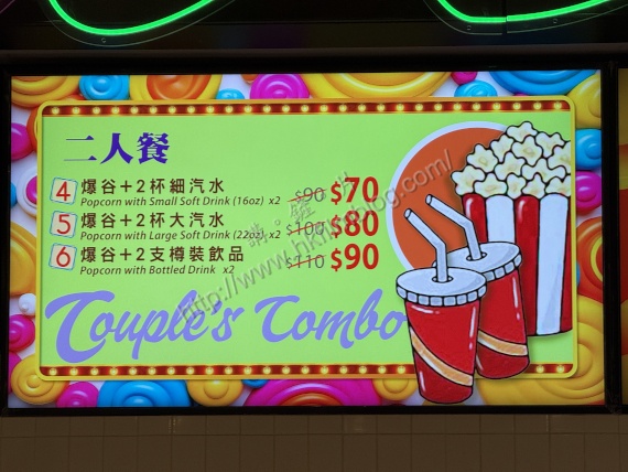 二人餐則是爆谷配上兩杯或兩支飲品,售價由90元至110元不等,現各款二人餐提供20元優惠。