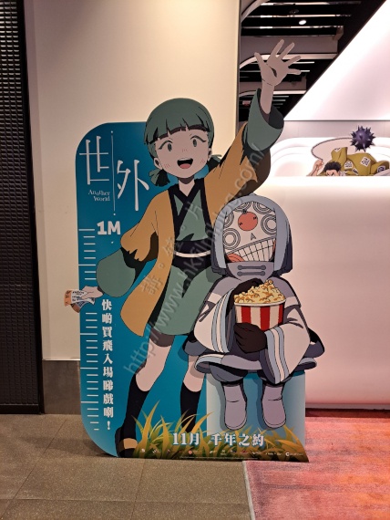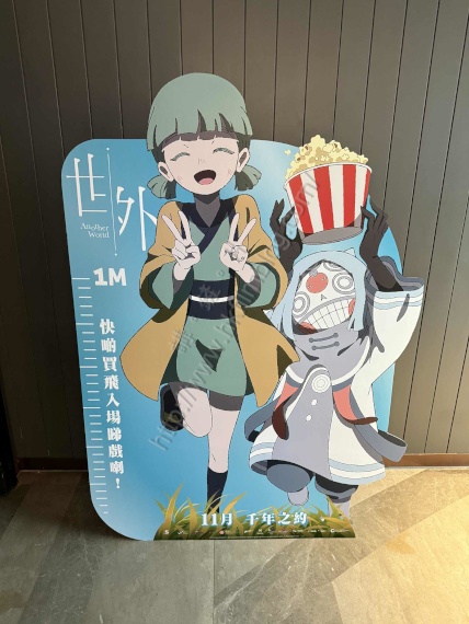 安樂發行、楊寶文監製、吳啟忠執導的《世外》將於十一月在港上映,並且在不同的戲阢開始展示其電影宣傳品。而上圖所見,則是「講。鏟。片」情報人員日前於尖沙咀iSquare英皇戲院所攝,可以看到在該戲院大堂的一角,擺放了《世外》的電影宣傳品。該宣傳品屬於量度一米身高的款式,看到片中兩位主角小妹與小鬼,當中小鬼拿著爆谷桶,而小妹雙手均舉起V字手勢。