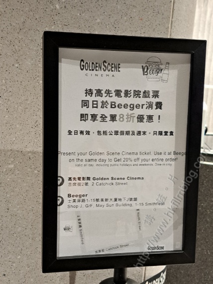 上圖所嵬,便是「講。鏟。片」情報人員近期於堅尼地城高先電影院的一角所攝。可以看到高先電影院跟住於士美菲路美新大廈的Beeger進行合作,觀眾只要持有高先電影院戲票,同日於beggar消費,就可以即享全單八折優惠。這個優惠全日有效,亦包括周末及公眾假期,不過優惠只限堂食。