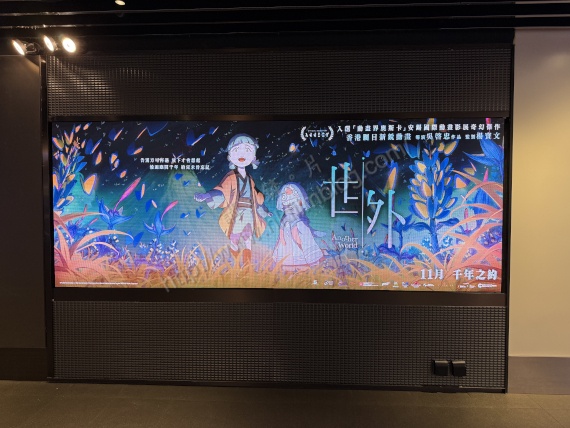 安樂發行、楊寶文監製、吳啟忠執導的動畫《世外》將於今年十一月在香港上映。而上圖所見,則是「講。鏟。片」情報人員於本月初在九龍站Premiere Elements所攝,可以看到戲院的大型屏幕,有著該片的宣傳。