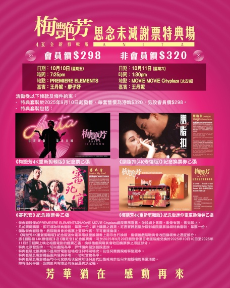 安樂發行、梁樂民執導,王丹妮、劉俊謙、廖子妤、古天樂、林家棟與楊千嬅主演的《梅艷芳》將於十月十日梅艷芳生日於百老匯院線獨家推出長達三小時的「4K全新剪輯版」。而安樂發行更是隆重其事,為此推出兩場特典場,並且於今天起推出特典套裝。