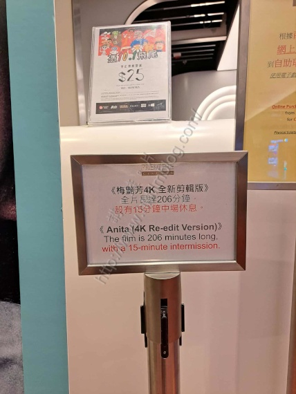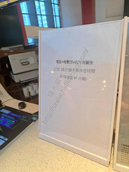而位於太古城中心的MOViE MOViE Cityplaza戲院,則在票房特別提供了溫馨提示,指電影《梅艷芳》因片長關係,設有15分鐘中場休息時間,而且更具體地指出中場休息安排於放映第97分鐘的時間。相信有關的提示,也許希望可以讓觀眾對於中場休息的情況能更易掌握。