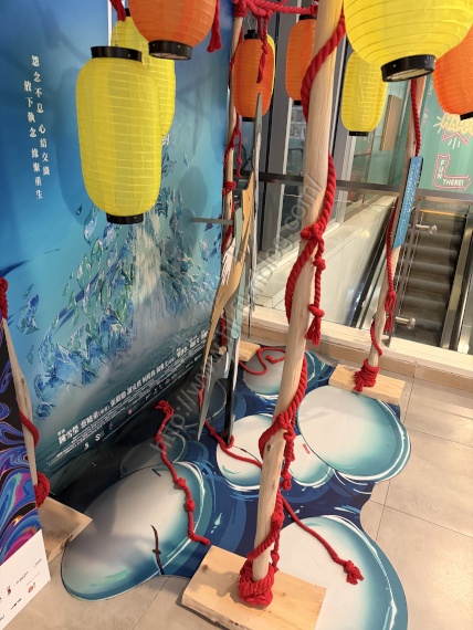 上圖所見,便是「講。鏟。片」情報人員日前於觀塘B+ cinema apm戲院大堂所攝,可以看到該戲院擺放了電影《世外》的立體宣傳品,宣傳品在設計上跟太古城的款惑相若,同樣包括了佈景板、地下與燈籠,只是不能發光。
