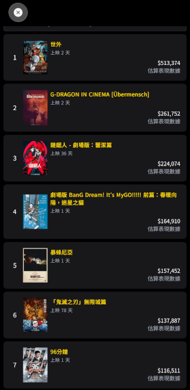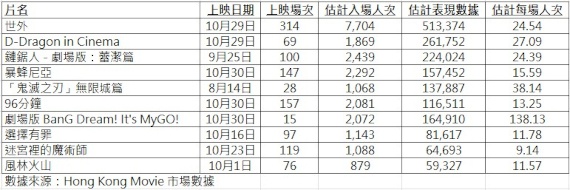 現在我們就利用一下Hong Kong Movie提供的數據,看看昨天的市場十部電影的數據情況: