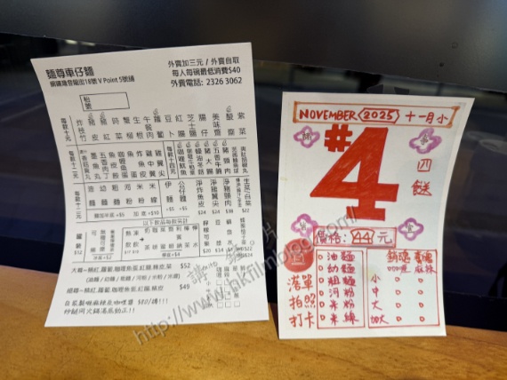 上圖所見,便是「講。鏟。片」情報人員日前於銅鑼灣登龍街的麵尊車仔麵店所攝,可以看到該食肆推出了「#4套餐」,套餐提供四餸車仔麵,當中麵款可選油麵、幼麵、粗麵、河粉、米粉或米線,同時可選咖喱與麻辣程度,承惠四十四元一碗。然而單看這張點餐紙,並未看到是哪四個餸。不過店員指四餸當中包了豬紅與芝士腸等。
