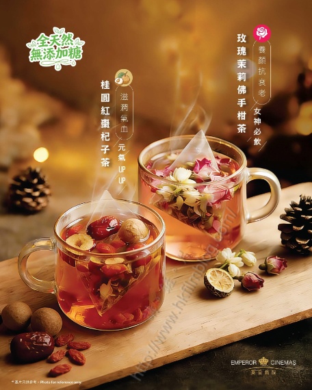 上圖所見,便是來自英皇戲院的官方Facebook專頁圖片,可以看到該戲院推出了兩款暖飲。左方為桂圓紅棗杞子茶,以「滋潤氣血」作為賣點。至於右方則為玫瑰茉莉佛手柑茶,以「養顏抗衰老」作為賣點。當中標榜全天然與無添加糖,以作為健康的選擇。