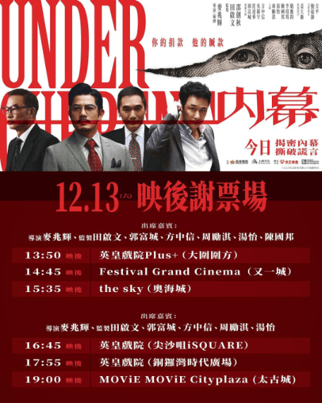 是次的謝票場共設有六場,當中星期六的場次分別為大圍圍方英皇戲院Plus+下午一時五十分、九龍塘Festival Grand下午兩時四十五分,以及奧海城The Sky下午三時三十五分。而星期日的場次則為尖沙咀iSquare英皇戲院下午四時四十五分、銅鑼灣時代廣場英皇戲院下午五時五十五分,以及太古城MOViE MOViE Cityplaza下午七時正。而謝票陣容則包括了導演麥兆輝、監製田啟文,演員郭富城、方中信、周勵淇與湯怡,而周末場次更有陳國邦加入。