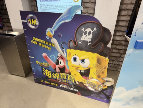 上圖所見,便是「講。鏟。片」情報人員日前於尖東站K11 Art House所攝,可以看到該戲院擺放了洲立發行的派拉蒙動畫《海綿寶寶:深海尋「寶」》的宣傳。這款宣傳以量度高度的設計,提醒小童高於一米就需要購票入場。同時也提示觀眾該片將於十二月二十日起推出優先場,並於十二月二十五日正式上映。而電影在港將會同時上映英語配音版與粵語配音版。