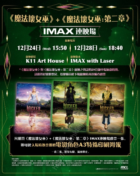 上圖所見,便是MCL院線在其官方Facebook專頁的通告,該院線位於尖東站K11 Art House的IMAX影廳,將會於聖誕節期間推出《魔法壞女巫》與《魔法壞女巫:第二章》連映場次。是次的IMAX連映場共設有兩場,分別為十二月二十四日平安夜下午五時五十分,以及十二月二十八日星期日下午六時四十分。