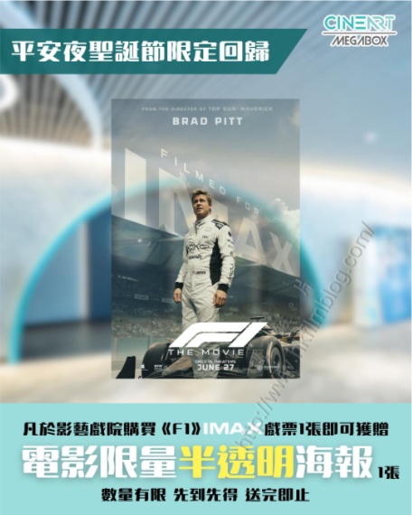 就以位於九龍灣MegaBox商場CineArt MegaBox影藝戲院為例,該戲院便於十二月二十四日平安夜起再度安排環球發行的華納賽車題材電《F1電影》的IMAX版本作限量上映,而當中十二月二十四日至二十六日的戲票已公開發售,而觀眾購票入坦可獲得半透明海報。