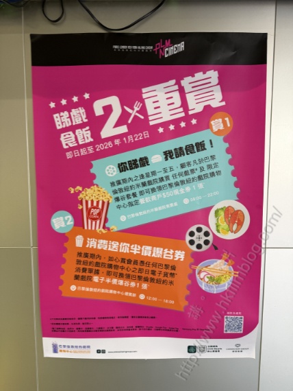 上圖所見,便是位於屯門新墟俗稱「巴倫紐」的巴黎倫敦紐約米蘭戲院的宣傳海報,該戲院推出了「睇戲食飯2重賞」,而推廣期直至一月二十二日。先是觀眾在推廣期內的星期一至五,於巴倫紐購買任何戲票及限定爆谷套餐,即可換領戲院所在的巴黎倫敦紐約戲院購物中心指定餐飲商戶五十元現金卷一張。