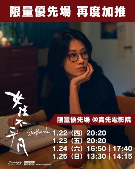 高先發行、徐欣羨執導,廖子妤、余香凝、鄧濤、韓寧、許恩怡與劉漪琳主演的《女孩不平凡》於三月五日在港上映,而電影自去年年底起推出限量優先場。而新一輪的限量優場安排於本周四至本周日假堅尼地城高先電影院放六場。放映時間分別為一月二十二日星期四與一月二十三日星期五晚上八時二十分、一月二十四日星期六下午四時五十分及五時四十分,以及一月二十五日星期日下午一時三十分與二時十五分。各場戲票現已於高先電影院票房及網站發售。