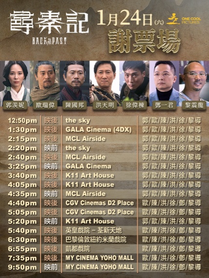 明天《尋秦記》的謝票場由早上十二時五十分至晚上九時五十分,合共謝票十七場,當中MCL Airside與K11 Art House各有三場,而是次更來到屯門兩間戲院巴黎倫敦紐約米蘭戲院及凱都戲院謝票。
